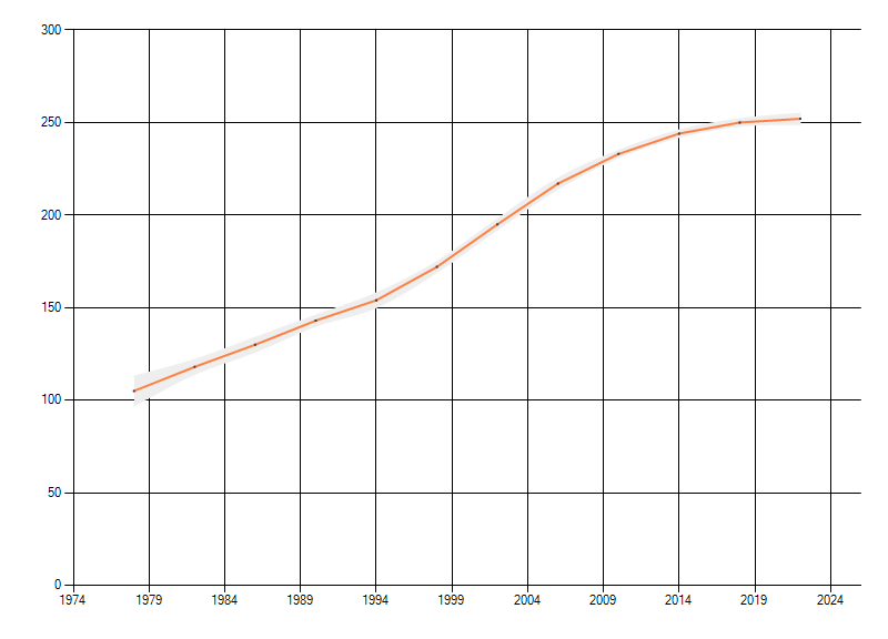 Gemiddelde trend van het aantal kilometerhokken waarin de soort voorkomt, weergegeven als indexcijfer (1975-1978 = 100).