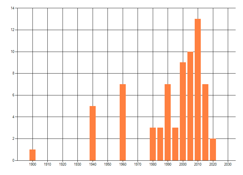 Het aantal atlasblokken (5x5 km) waarin de soort is gemeld binnen een periode van vijf jaar (vanaf 1980) of twintig jaar. Niet gecorrigeerd voor waarnemersinspanning en het aantal doorgegeven waarnemingen kan sterk variëren per periode, dus een trend in verspreiding kan hier niet direct uit worden afgelezen. Het opgegeven jaartal is het eerste jaar van de periode. Bron: gevalideerde waarnemingen uit de NDFF.