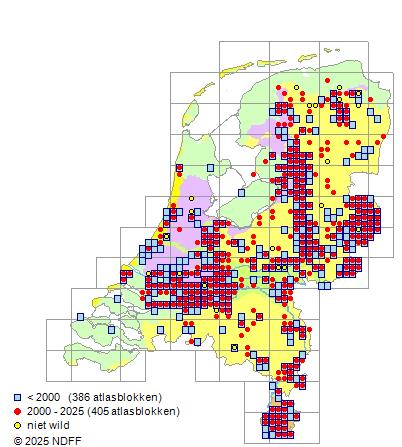 CC BY-NC-SA 3.0 NLVerspreidingNederlandPlaatselijk vrij algemeen in het rivierengebied, in laagveengebieden, in Twente, de Achterhoek en Zuid-Limburg. Elders zeldzaam tot zeer zeldzaam. Niet op de Waddeneilanden en in het noordelijk zeekleigebied.