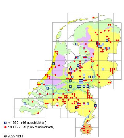 Het aantal atlasblokken (5x5 km) waarin de soort is gemeld binnen een periode van vijf jaar (vanaf 1980) of twintig jaar. Niet gecorrigeerd voor waarnemersinspanning en het aantal doorgegeven waarnemingen kan sterk variëren per periode, dus een trend in verspreiding kan hier niet direct uit worden afgelezen. Het opgegeven jaartal is het eerste jaar van de periode. Bron: gevalideerde waarnemingen uit de NDFF.