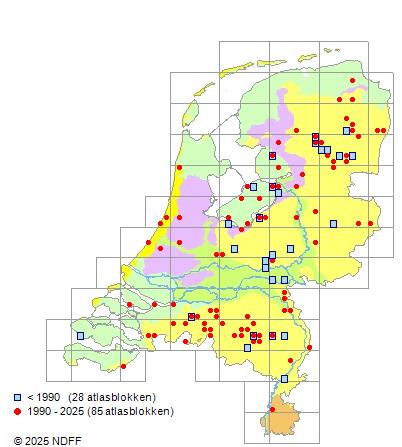 Het aantal atlasblokken (5x5 km) waarin de soort is gemeld binnen een periode van vijf jaar (vanaf 1980) of twintig jaar. Niet gecorrigeerd voor waarnemersinspanning en het aantal doorgegeven waarnemingen kan sterk variëren per periode, dus een trend in verspreiding kan hier niet direct uit worden afgelezen. Het opgegeven jaartal is het eerste jaar van de periode. Bron: gevalideerde waarnemingen uit de NDFF.