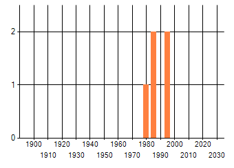 Het aantal atlasblokken (5x5 km) waarin de soort is gemeld binnen een periode van vijf jaar (vanaf 1980) of twintig jaar. Niet gecorrigeerd voor waarnemersinspanning en het aantal doorgegeven waarnemingen kan sterk variëren per periode, dus een trend in verspreiding kan hier niet direct uit worden afgelezen. Het opgegeven jaartal is het eerste jaar van de periode. Bron: gevalideerde waarnemingen uit de NDFF.