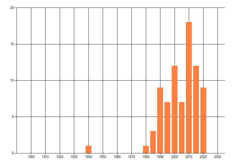 Het aantal atlasblokken (5x5 km) waarin de soort is gemeld binnen een periode van vijf jaar (vanaf 1980) of twintig jaar. Niet gecorrigeerd voor waarnemersinspanning en het aantal doorgegeven waarnemingen kan sterk variëren per periode, dus een trend in verspreiding kan hier niet direct uit worden afgelezen. Het opgegeven jaartal is het eerste jaar van de periode. Bron: gevalideerde waarnemingen uit de NDFF.