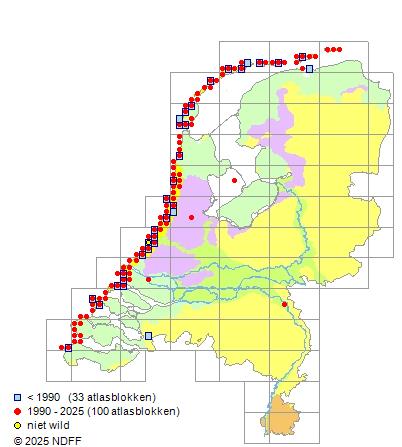 Het aantal atlasblokken (5x5 km) waarin de soort is gemeld binnen een periode van vijf jaar (vanaf 1980) of twintig jaar. Niet gecorrigeerd voor waarnemersinspanning en het aantal doorgegeven waarnemingen kan sterk variëren per periode, dus een trend in verspreiding kan hier niet direct uit worden afgelezen. Het opgegeven jaartal is het eerste jaar van de periode. Bron: gevalideerde waarnemingen uit de NDFF.