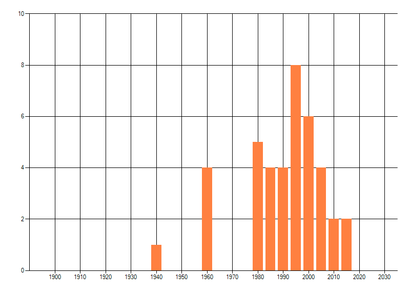 Het aantal atlasblokken (5x5 km) waarin de soort is gemeld binnen een periode van vijf jaar (vanaf 1980) of twintig jaar. Niet gecorrigeerd voor waarnemersinspanning en het aantal doorgegeven waarnemingen kan sterk variëren per periode, dus een trend in verspreiding kan hier niet direct uit worden afgelezen. Het opgegeven jaartal is het eerste jaar van de periode. Bron: gevalideerde waarnemingen uit de NDFF.
