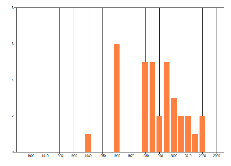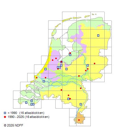 Het aantal atlasblokken (5x5 km) waarin de soort is gemeld binnen een periode van vijf jaar (vanaf 1980) of twintig jaar. Niet gecorrigeerd voor waarnemersinspanning en het aantal doorgegeven waarnemingen kan sterk variëren per periode, dus een trend in verspreiding kan hier niet direct uit worden afgelezen. Het opgegeven jaartal is het eerste jaar van de periode. Bron: gevalideerde waarnemingen uit de NDFF.
