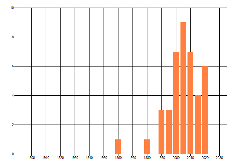 Het aantal atlasblokken (5x5 km) waarin de soort is gemeld binnen een periode van vijf jaar (vanaf 1980) of twintig jaar. Niet gecorrigeerd voor waarnemersinspanning en het aantal doorgegeven waarnemingen kan sterk variëren per periode, dus een trend in verspreiding kan hier niet direct uit worden afgelezen. Het opgegeven jaartal is het eerste jaar van de periode. Bron: gevalideerde waarnemingen uit de NDFF.