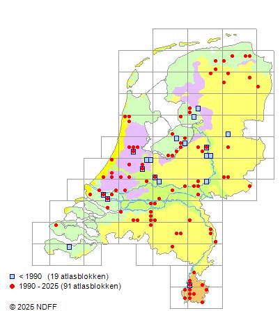 Het aantal atlasblokken (5x5 km) waarin de soort is gemeld binnen een periode van vijf jaar (vanaf 1980) of twintig jaar. Niet gecorrigeerd voor waarnemersinspanning en het aantal doorgegeven waarnemingen kan sterk variëren per periode, dus een trend in verspreiding kan hier niet direct uit worden afgelezen. Het opgegeven jaartal is het eerste jaar van de periode. Bron: gevalideerde waarnemingen uit de NDFF.
