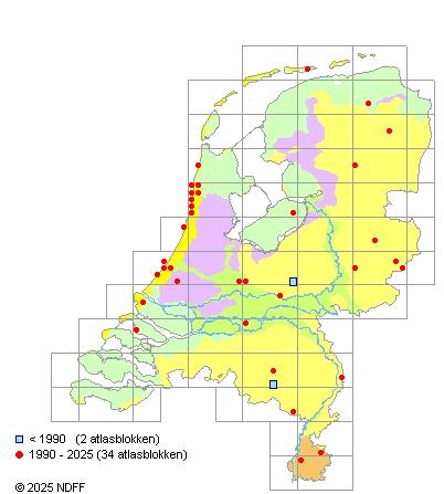 Het aantal atlasblokken (5x5 km) waarin de soort is gemeld binnen een periode van vijf jaar (vanaf 1980) of twintig jaar.