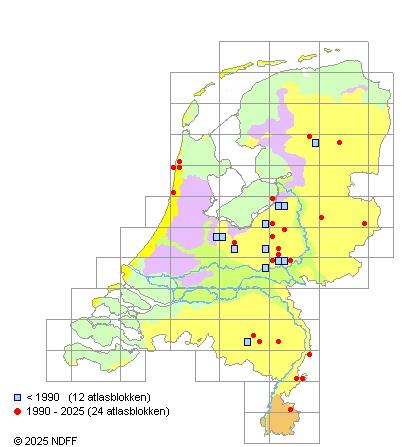 Het aantal atlasblokken (5x5 km) waarin de soort is gemeld binnen een periode van vijf jaar (vanaf 1980) of twintig jaar. Niet gecorrigeerd voor waarnemersinspanning en het aantal doorgegeven waarnemingen kan sterk variëren per periode, dus een trend in verspreiding kan hier niet direct uit worden afgelezen. Het opgegeven jaartal is het eerste jaar van de periode. Bron: gevalideerde waarnemingen uit de NDFF.