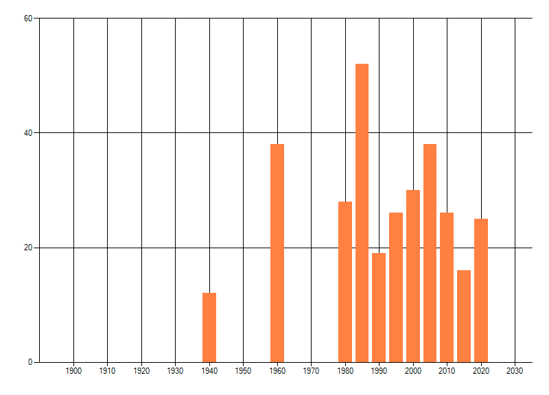 Het aantal atlasblokken (5x5 km) waarin de soort is gemeld binnen een periode van vijf jaar (vanaf 1980) of twintig jaar. Niet gecorrigeerd voor waarnemersinspanning en het aantal doorgegeven waarnemingen kan sterk variëren per periode, dus een trend in verspreiding kan hier niet direct uit worden afgelezen. Het opgegeven jaartal is het eerste jaar van de periode. Bron: gevalideerde waarnemingen uit de NDFF.