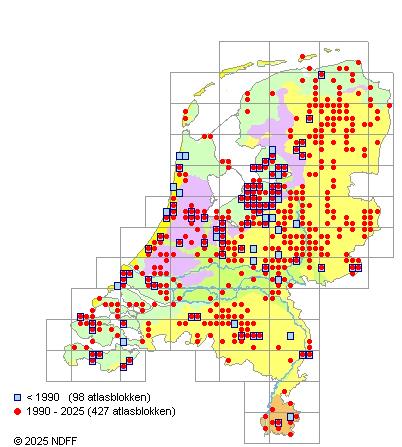 Het aantal atlasblokken (5x5 km) waarin de soort is gemeld binnen een periode van vijf jaar (vanaf 1980) of twintig jaar. Niet gecorrigeerd voor waarnemersinspanning en het aantal doorgegeven waarnemingen kan sterk variëren per periode, dus een trend in verspreiding kan hier niet direct uit worden afgelezen. Het opgegeven jaartal is het eerste jaar van de periode. Bron: gevalideerde waarnemingen uit de NDFF.
