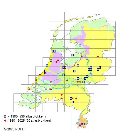 Het aantal atlasblokken (5x5 km) waarin de soort is gemeld binnen een periode van vijf jaar (vanaf 1980) of twintig jaar. Niet gecorrigeerd voor waarnemersinspanning en het aantal doorgegeven waarnemingen kan sterk variëren per periode, dus een trend in verspreiding kan hier niet direct uit worden afgelezen. Het opgegeven jaartal is het eerste jaar van de periode. Bron: gevalideerde waarnemingen uit de NDFF.