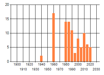 Het aantal atlasblokken (5x5 km) waarin de soort is gemeld binnen een periode van vijf jaar (vanaf 1980) of twintig jaar. Niet gecorrigeerd voor waarnemersinspanning en het aantal doorgegeven waarnemingen kan sterk variëren per periode, dus een trend in verspreiding kan hier niet direct uit worden afgelezen. Het opgegeven jaartal is het eerste jaar van de periode. Bron: gevalideerde waarnemingen uit de NDFF.