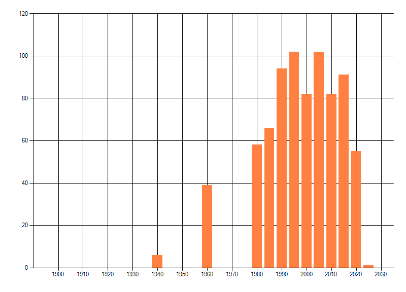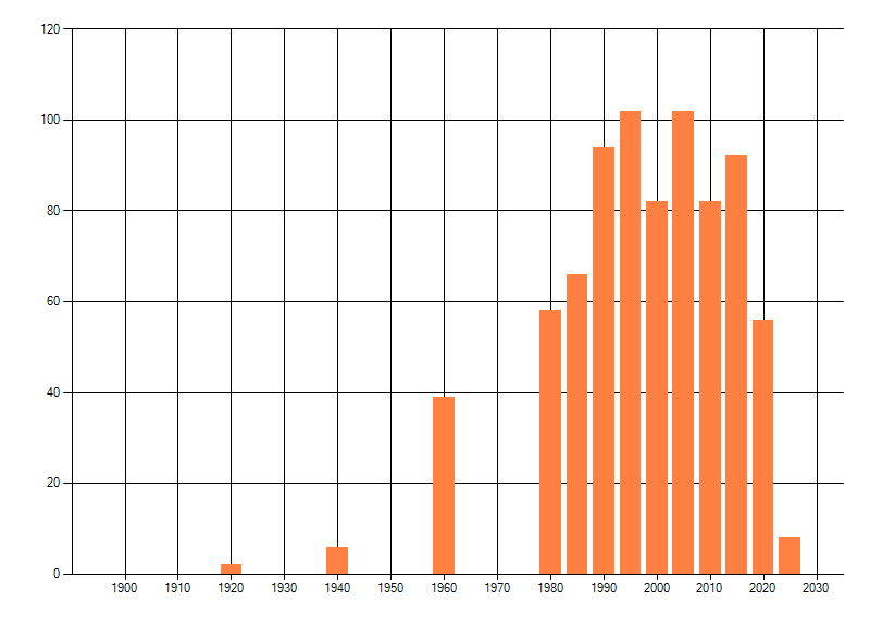 Het aantal atlasblokken (5x5 km) waarin de soort is gemeld binnen een periode van vijf jaar (vanaf 1980) of twintig jaar. Niet gecorrigeerd voor waarnemersinspanning en het aantal doorgegeven waarnemingen kan sterk variëren per periode, dus een trend in verspreiding kan hier niet direct uit worden afgelezen. Het opgegeven jaartal is het eerste jaar van de periode. Bron: gevalideerde waarnemingen uit de NDFF.