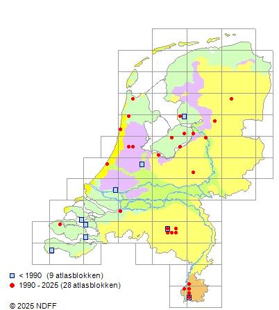 Het aantal atlasblokken (5x5 km) waarin de soort is gemeld binnen een periode van vijf jaar (vanaf 1980) of twintig jaar. Niet gecorrigeerd voor waarnemersinspanning en het aantal doorgegeven waarnemingen kan sterk variëren per periode, dus een trend in verspreiding kan hier niet direct uit worden afgelezen. Het opgegeven jaartal is het eerste jaar van de periode. Bron: gevalideerde waarnemingen uit de NDFF.