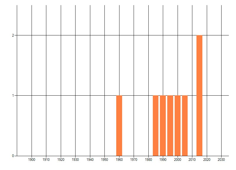 Het aantal atlasblokken (5x5 km) waarin de soort is gemeld binnen een periode van vijf jaar (vanaf 1980) of twintig jaar. Niet gecorrigeerd voor waarnemersinspanning en het aantal doorgegeven waarnemingen kan sterk variëren per periode, dus een trend in verspreiding kan hier niet direct uit worden afgelezen. Het opgegeven jaartal is het eerste jaar van de periode. Bron: gevalideerde waarnemingen uit de NDFF.