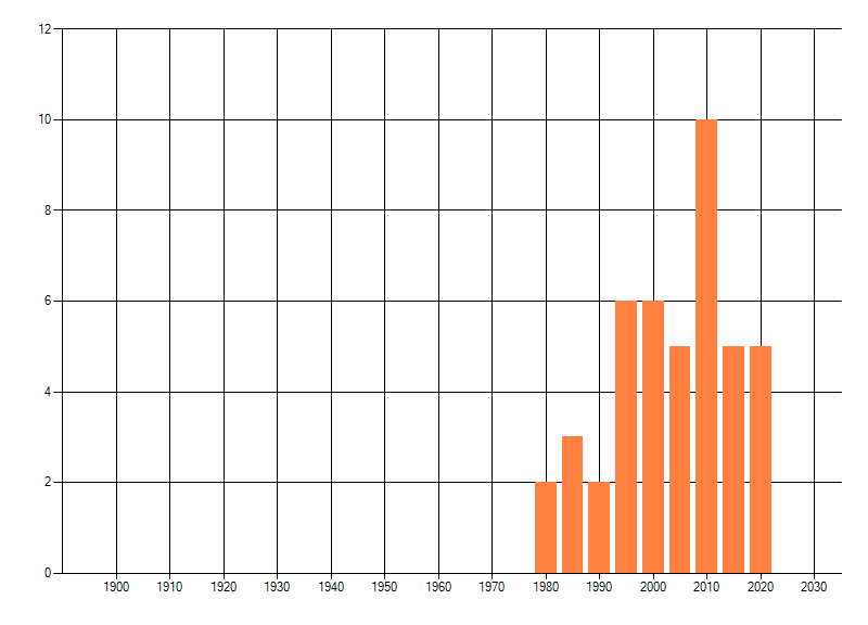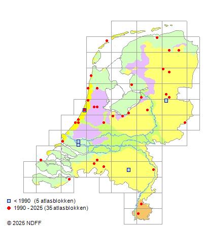 Het aantal atlasblokken (5x5 km) waarin de soort is gemeld binnen een periode van vijf jaar (vanaf 1980) of twintig jaar. Niet gecorrigeerd voor waarnemersinspanning en het aantal doorgegeven waarnemingen kan sterk variëren per periode, dus een trend in verspreiding kan hier niet direct uit worden afgelezen. Het opgegeven jaartal is het eerste jaar van de periode. Bron: gevalideerde waarnemingen uit de NDFF.