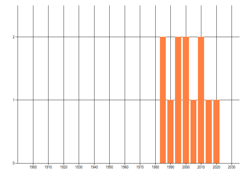 Het aantal atlasblokken (5x5 km) waarin de soort is gemeld binnen een periode van vijf jaar (vanaf 1980) of twintig jaar. Niet gecorrigeerd voor waarnemersinspanning en het aantal doorgegeven waarnemingen kan sterk variëren per periode, dus een trend in verspreiding kan hier niet direct uit worden afgelezen. Het opgegeven jaartal is het eerste jaar van de periode. Bron: gevalideerde waarnemingen uit de NDFF.