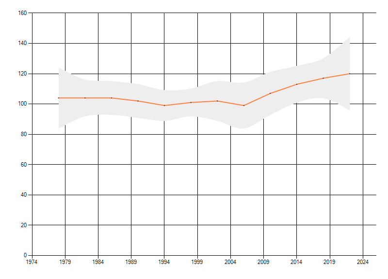 Gemiddelde trend van het aantal kilometerhokken waarin de soort voorkomt, weergegeven als indexcijfer (1975-1978 = 100).