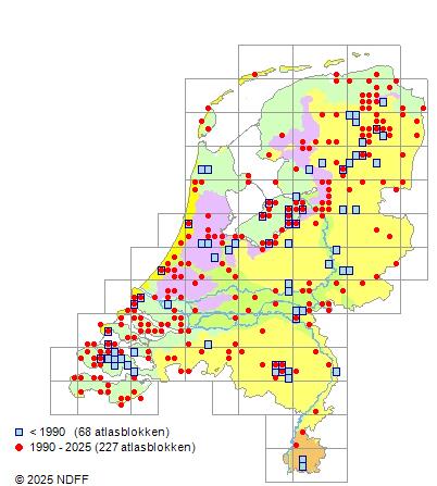 Het aantal atlasblokken (5x5 km) waarin de soort is gemeld binnen een periode van vijf jaar (vanaf 1980) of twintig jaar. Niet gecorrigeerd voor waarnemersinspanning en het aantal doorgegeven waarnemingen kan sterk variëren per periode, dus een trend in verspreiding kan hier niet direct uit worden afgelezen. Het opgegeven jaartal is het eerste jaar van de periode. Bron: gevalideerde waarnemingen uit de NDFF.