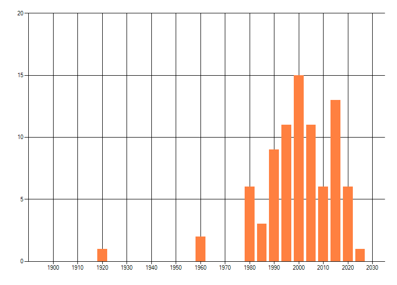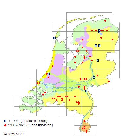Het aantal atlasblokken (5x5 km) waarin de soort is gemeld binnen een periode van vijf jaar (vanaf 1980) of twintig jaar. Niet gecorrigeerd voor waarnemersinspanning en het aantal doorgegeven waarnemingen kan sterk variëren per periode, dus een trend in verspreiding kan hier niet direct uit worden afgelezen. Het opgegeven jaartal is het eerste jaar van de periode. Bron: gevalideerde waarnemingen uit de NDFF.