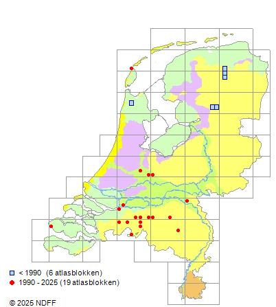 Het aantal atlasblokken (5x5 km) waarin de soort is gemeld binnen een periode van vijf jaar (vanaf 1980) of twintig jaar. Niet gecorrigeerd voor waarnemersinspanning en het aantal doorgegeven waarnemingen kan sterk variëren per periode, dus een trend in verspreiding kan hier niet direct uit worden afgelezen. Het opgegeven jaartal is het eerste jaar van de periode. Bron: gevalideerde waarnemingen uit de NDFF.