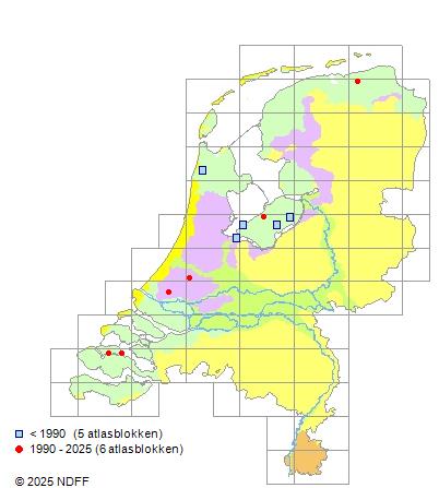 Volgens bestand NMV uiterst zeld. (O. Flevoland, Biddinghuizen, 1977; Schagen); waarschijnlijk wijder verbreid.
