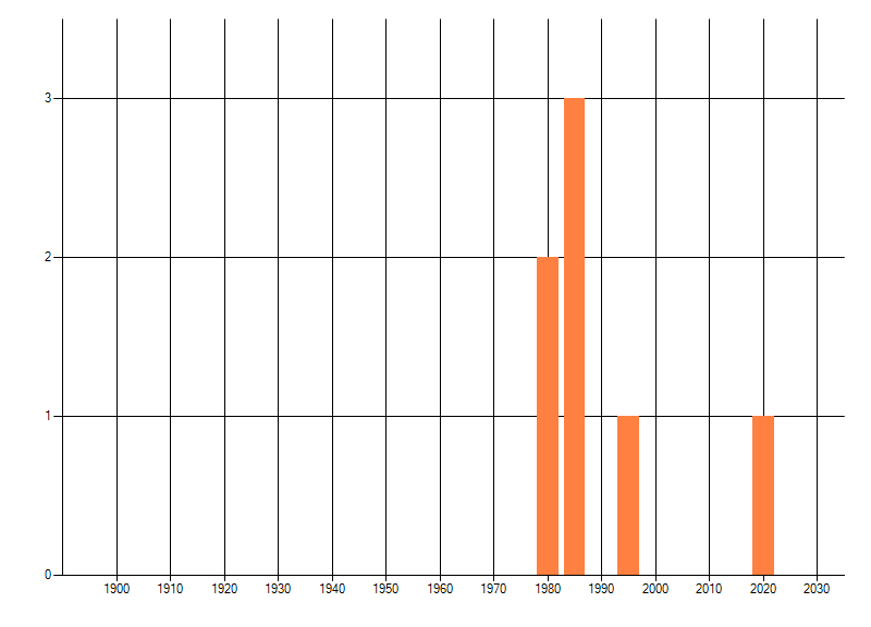 Het aantal atlasblokken (5x5 km) waarin de soort is gemeld binnen een periode van vijf jaar (vanaf 1980) of twintig jaar. Niet gecorrigeerd voor waarnemersinspanning en het aantal doorgegeven waarnemingen kan sterk variëren per periode, dus een trend in verspreiding kan hier niet direct uit worden afgelezen. Het opgegeven jaartal is het eerste jaar van de periode. Bron: gevalideerde waarnemingen uit de NDFF.