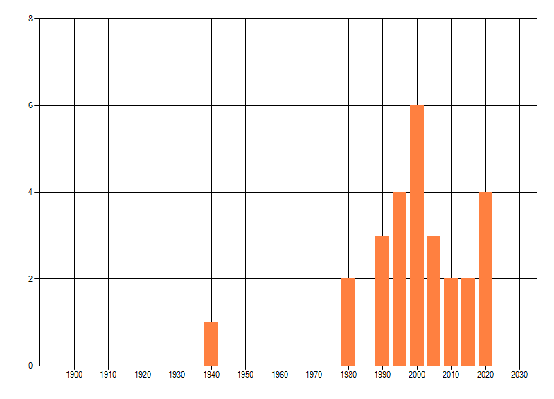 Het aantal atlasblokken (5x5 km) waarin de soort is gemeld binnen een periode van vijf jaar (vanaf 1980) of twintig jaar. Niet gecorrigeerd voor waarnemersinspanning en het aantal doorgegeven waarnemingen kan sterk variëren per periode, dus een trend in verspreiding kan hier niet direct uit worden afgelezen. Het opgegeven jaartal is het eerste jaar van de periode. Bron: gevalideerde waarnemingen uit de NDFF.