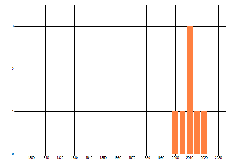 Het aantal atlasblokken (5x5 km) waarin de soort is gemeld binnen een periode van vijf jaar (vanaf 1980) of twintig jaar. Niet gecorrigeerd voor waarnemersinspanning en het aantal doorgegeven waarnemingen kan sterk variëren per periode, dus een trend in verspreiding kan hier niet direct uit worden afgelezen. Het opgegeven jaartal is het eerste jaar van de periode. Bron: gevalideerde waarnemingen uit de NDFF.