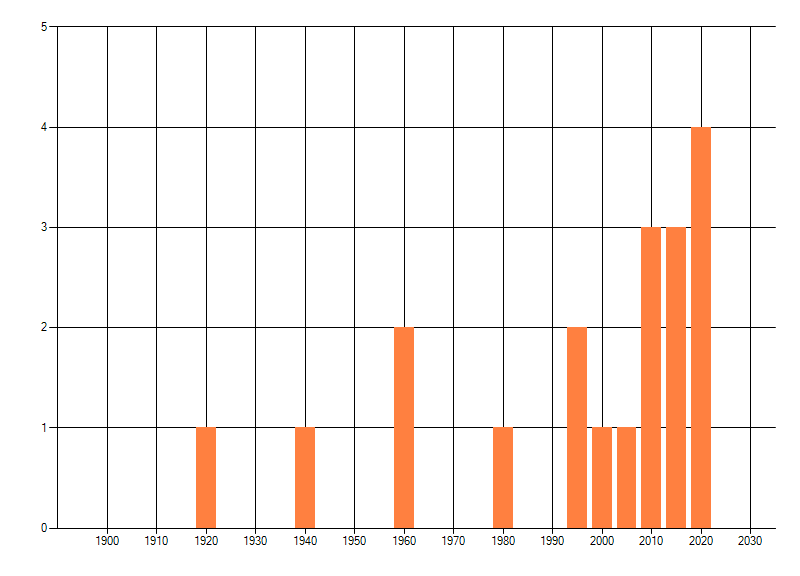 Het aantal atlasblokken (5x5 km) waarin de soort is gemeld binnen een periode van vijf jaar (vanaf 1980) of twintig jaar. Niet gecorrigeerd voor waarnemersinspanning en het aantal doorgegeven waarnemingen kan sterk variëren per periode, dus een trend in verspreiding kan hier niet direct uit worden afgelezen. Het opgegeven jaartal is het eerste jaar van de periode. Bron: gevalideerde waarnemingen uit de NDFF.