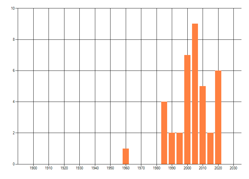 Het aantal atlasblokken (5x5 km) waarin de soort is gemeld binnen een periode van vijf jaar (vanaf 1980) of twintig jaar. Niet gecorrigeerd voor waarnemersinspanning en het aantal doorgegeven waarnemingen kan sterk variëren per periode, dus een trend in verspreiding kan hier niet direct uit worden afgelezen. Het opgegeven jaartal is het eerste jaar van de periode. Bron: gevalideerde waarnemingen uit de NDFF.
