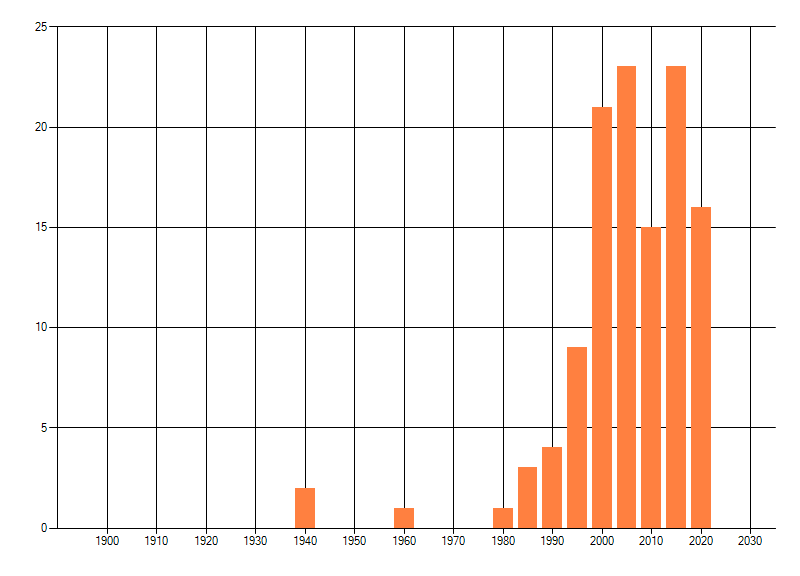 Het aantal atlasblokken (5x5 km) waarin de soort is gemeld binnen een periode van vijf jaar (vanaf 1980) of twintig jaar. Niet gecorrigeerd voor waarnemersinspanning en het aantal doorgegeven waarnemingen kan sterk variëren per periode, dus een trend in verspreiding kan hier niet direct uit worden afgelezen. Het opgegeven jaartal is het eerste jaar van de periode. Bron: gevalideerde waarnemingen uit de NDFF.