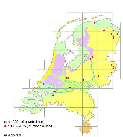 Het aantal atlasblokken (5x5 km) waarin de soort is gemeld binnen een periode van vijf jaar (vanaf 1980) of twintig jaar. Niet gecorrigeerd voor waarnemersinspanning en het aantal doorgegeven waarnemingen kan sterk variëren per periode, dus een trend in verspreiding kan hier niet direct uit worden afgelezen. Het opgegeven jaartal is het eerste jaar van de periode. Bron: gevalideerde waarnemingen uit de NDFF.