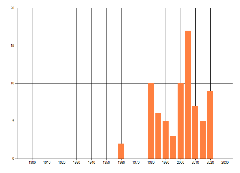Het aantal atlasblokken (5x5 km) waarin de soort is gemeld binnen een periode van vijf jaar (vanaf 1980) of twintig jaar. Niet gecorrigeerd voor waarnemersinspanning en het aantal doorgegeven waarnemingen kan sterk variëren per periode, dus een trend in verspreiding kan hier niet direct uit worden afgelezen. Het opgegeven jaartal is het eerste jaar van de periode. Bron: gevalideerde waarnemingen uit de NDFF.