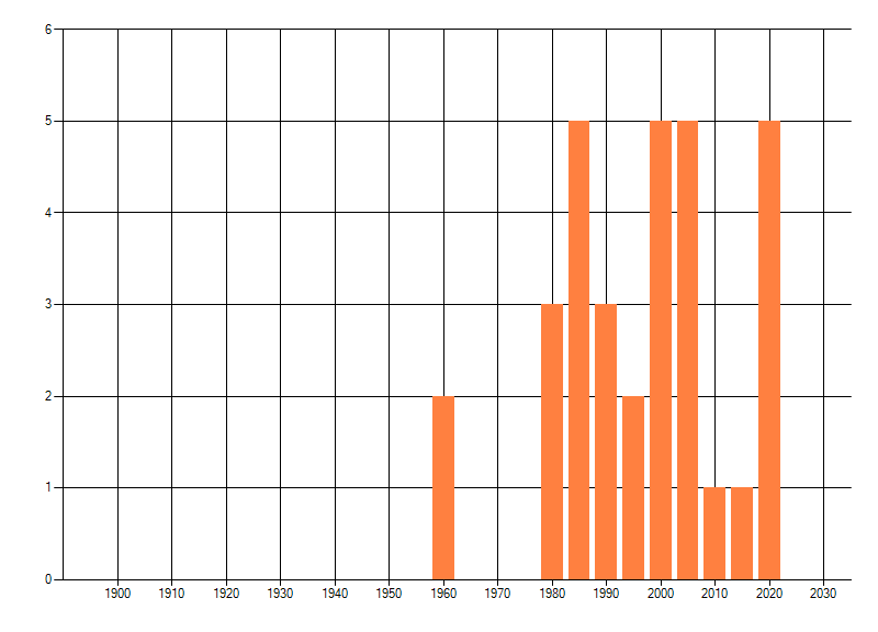 Het aantal atlasblokken (5x5 km) waarin de soort is gemeld binnen een periode van vijf jaar (vanaf 1980) of twintig jaar. Niet gecorrigeerd voor waarnemersinspanning en het aantal doorgegeven waarnemingen kan sterk variëren per periode, dus een trend in verspreiding kan hier niet direct uit worden afgelezen. Het opgegeven jaartal is het eerste jaar van de periode. Bron: gevalideerde waarnemingen uit de NDFF.