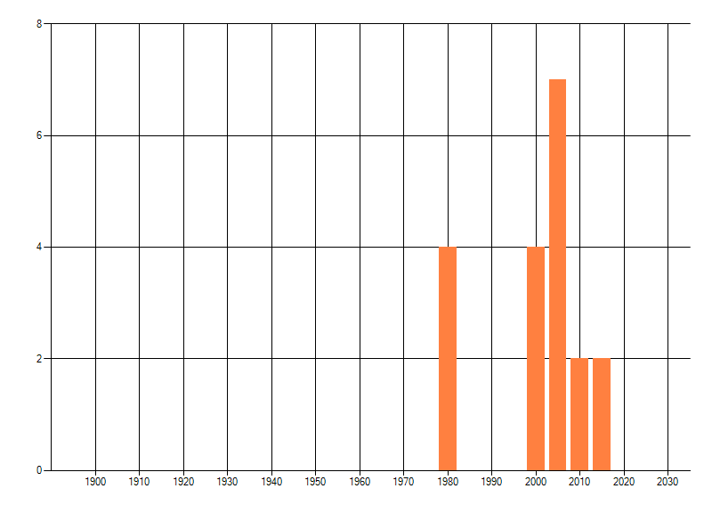Het aantal atlasblokken (5x5 km) waarin de soort is gemeld binnen een periode van vijf jaar (vanaf 1980) of twintig jaar. Niet gecorrigeerd voor waarnemersinspanning en het aantal doorgegeven waarnemingen kan sterk variëren per periode, dus een trend in verspreiding kan hier niet direct uit worden afgelezen. Het opgegeven jaartal is het eerste jaar van de periode. Bron: gevalideerde waarnemingen uit de NDFF.