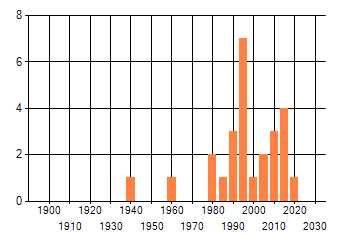 Het aantal atlasblokken (5x5 km) waarin de soort is gemeld binnen een periode van vijf jaar (vanaf 1980) of twintig jaar. Niet gecorrigeerd voor waarnemersinspanning en het aantal doorgegeven waarnemingen kan sterk variëren per periode, dus een trend in verspreiding kan hier niet direct uit worden afgelezen. Het opgegeven jaartal is het eerste jaar van de periode. Bron: gevalideerde waarnemingen uit de NDFF.