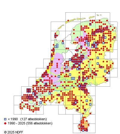 Het aantal atlasblokken (5x5 km) waarin de soort is gemeld binnen een periode van vijf jaar (vanaf 1980) of twintig jaar. Niet gecorrigeerd voor waarnemersinspanning en het aantal doorgegeven waarnemingen kan sterk variëren per periode, dus een trend in verspreiding kan hier niet direct uit worden afgelezen. Het opgegeven jaartal is het eerste jaar van de periode. Bron: gevalideerde waarnemingen uit de NDFF.