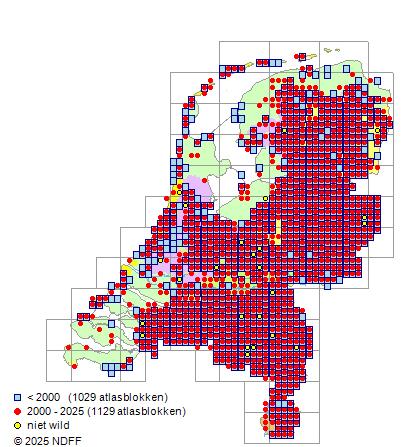 CC BY-NC-SA 3.0 NLVerspreidingNederlandVrij algemeen in het oosten en midden van het land, in aangrenzende laagveengebieden en het aangrenzende rivierengebied. Vrij zeldzaam in Zuid-Limburg en op de Waddeneilanden. Elders zeer zeldzaam.