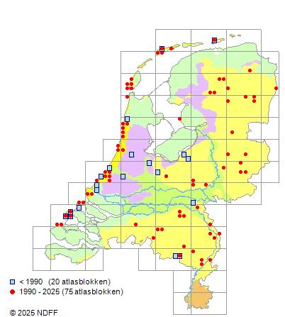Het aantal atlasblokken (5x5 km) waarin de soort is gemeld binnen een periode van vijf jaar (vanaf 1980) of twintig jaar. Niet gecorrigeerd voor waarnemersinspanning en het aantal doorgegeven waarnemingen kan sterk variëren per periode, dus een trend in verspreiding kan hier niet direct uit worden afgelezen. Het opgegeven jaartal is het eerste jaar van de periode. Bron: gevalideerde waarnemingen uit de NDFF.