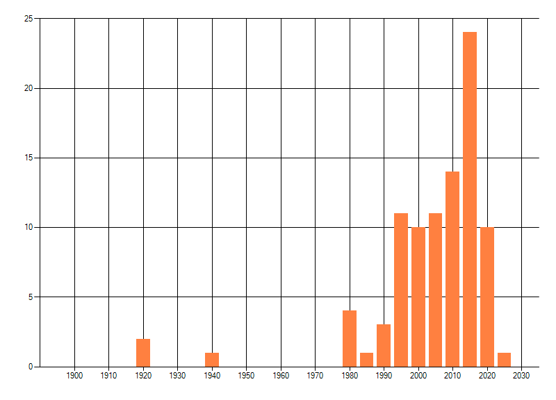 Het aantal atlasblokken (5x5 km) waarin de soort is gemeld binnen een periode van vijf jaar (vanaf 1980) of twintig jaar. Niet gecorrigeerd voor waarnemersinspanning en het aantal doorgegeven waarnemingen kan sterk variëren per periode, dus een trend in verspreiding kan hier niet direct uit worden afgelezen. Het opgegeven jaartal is het eerste jaar van de periode. Bron: gevalideerde waarnemingen uit de NDFF.