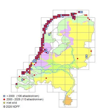 Het aantal atlasblokken (5x5 km) waarin de soort is gemeld binnen een periode van vijf jaar (vanaf 1980) of twintig jaar. Niet gecorrigeerd voor waarnemersinspanning en het aantal doorgegeven waarnemingen kan sterk variëren per periode, dus een trend in verspreiding kan hier niet direct uit worden afgelezen. Het opgegeven jaartal is het eerste jaar van de periode. Bron: gevalideerde waarnemingen uit de NDFF.