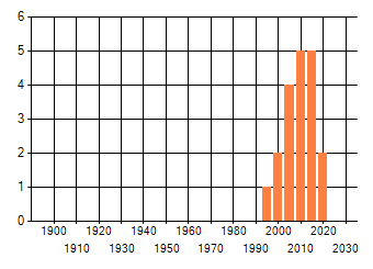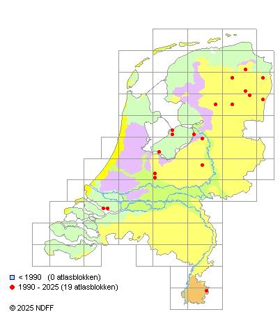Het aantal atlasblokken (5x5 km) waarin de soort is gemeld binnen een periode van vijf jaar (vanaf 1980) of twintig jaar. Niet gecorrigeerd voor waarnemersinspanning en het aantal doorgegeven waarnemingen kan sterk variëren per periode, dus een trend in verspreiding kan hier niet direct uit worden afgelezen. Het opgegeven jaartal is het eerste jaar van de periode. Bron: gevalideerde waarnemingen uit de NDFF.