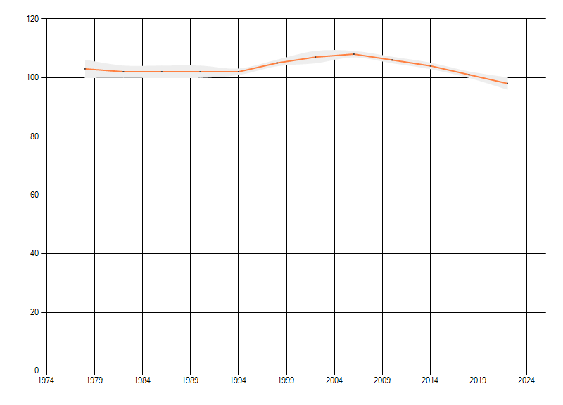 Gemiddelde trend van het aantal kilometerhokken waarin de soort voorkomt, weergegeven als indexcijfer (1975-1978 = 100). De trend is gecorrigeerd voor waarnemersinspanning en geeft de relatieve verandering in het aantal bezette kilometerhokken weer. Voor de berekening worden de data per periode van vier jaar samengenomen. In de grafiek correspondeert ieder punt met het laatste jaar van zo'n periode.