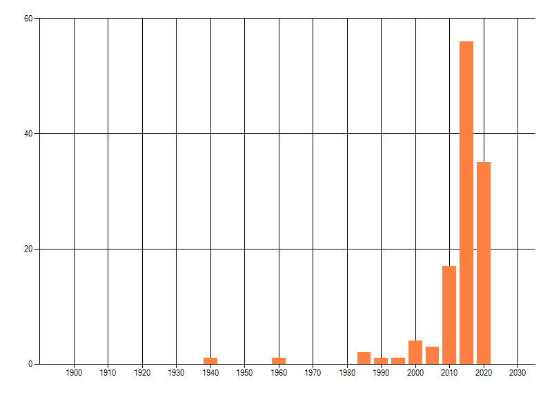 Het aantal atlasblokken (5x5 km) waarin de soort is gemeld binnen een periode van vijf jaar (vanaf 1980) of twintig jaar. Niet gecorrigeerd voor waarnemersinspanning en het aantal doorgegeven waarnemingen kan sterk variëren per periode, dus een trend in verspreiding kan hier niet direct uit worden afgelezen. Het opgegeven jaartal is het eerste jaar van de periode. Bron: gevalideerde waarnemingen uit de NDFF.