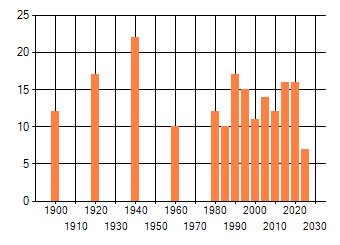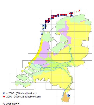 Het aantal atlasblokken (5x5 km) waarin de soort is gemeld binnen een periode van vijf jaar (vanaf 1980) of twintig jaar. Niet gecorrigeerd voor waarnemersinspanning en het aantal doorgegeven waarnemingen kan sterk variëren per periode, dus een trend in verspreiding kan hier niet direct uit worden afgelezen. Het opgegeven jaartal is het eerste jaar van de periode. Bron: gevalideerde waarnemingen uit de NDFF.