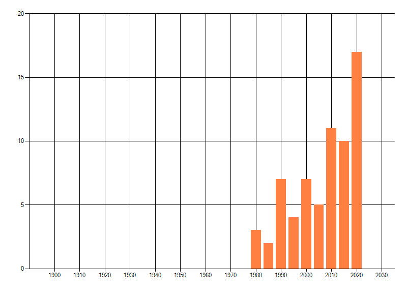 Het aantal atlasblokken (5x5 km) waarin de soort is gemeld binnen een periode van vijf jaar (vanaf 1980) of twintig jaar. Niet gecorrigeerd voor waarnemersinspanning en het aantal doorgegeven waarnemingen kan sterk variëren per periode, dus een trend in verspreiding kan hier niet direct uit worden afgelezen. Het opgegeven jaartal is het eerste jaar van de periode. Bron: gevalideerde waarnemingen uit de NDFF.