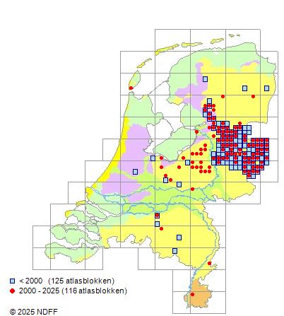 Het aantal atlasblokken (5x5 km) waarin de soort is gemeld binnen een periode van vijf jaar (vanaf 1980) of twintig jaar. Niet gecorrigeerd voor waarnemersinspanning en het aantal doorgegeven waarnemingen kan sterk variëren per periode, dus een trend in verspreiding kan hier niet direct uit worden afgelezen. Het opgegeven jaartal is het eerste jaar van de periode. Bron: gevalideerde waarnemingen uit de NDFF.